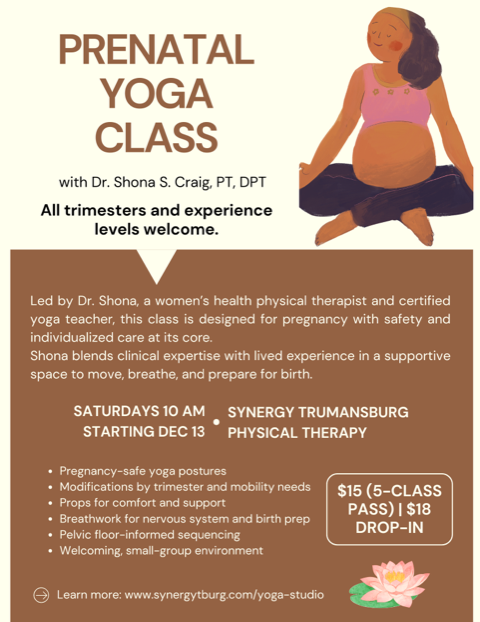 Breathwork and simple meditation are woven into each session to support emotional well-being and nervous system balance. The class honors the physical and emotional rhythms of pregnancy, offering modifications by trimester and individual needs so each person can move in a way that feels right.